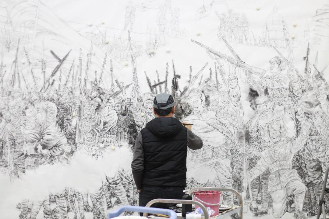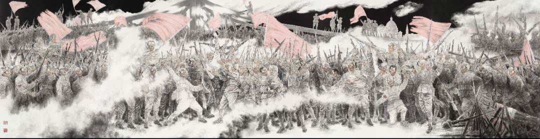 沖鋒陷陣的解放軍將士,冒著槍林彈雨會師金湯橋。上百位英雄人物,或漫卷紅旗,或手握鋼槍,或喜極而泣,或仰天長嘯……站在天津畫院展覽館中,眼前這幅高2.6米、長10米的鴻篇巨制《天津解放——會師金湯橋》,利用宏大敘事的方法將解放軍將士會師金湯橋的歷史躍然紙上,以極富張力的藝術創作,極其強烈的視覺沖擊,帶給觀者心靈上的巨大震撼。