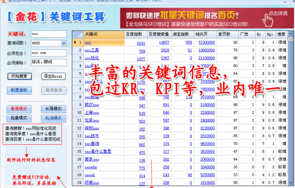 金花關鍵詞工具是一款批量查詢關鍵詞工具,推出以后收到很多草根seo站長的喜愛。該關鍵詞工具集眾多功能與一身,包含百度指數、關鍵詞、百度索引量、長尾詞模式,批量模式等等。
