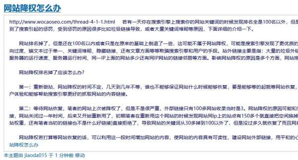 這是我在搜索“網站降權了怎么辦”中發現到的一個頁面,我關注的是網站降權了怎么辦,但是頁面給我的的是:1、重新做網站;2等待恢復!正常搞網站的人都知道,這2個答案真是瞎扯了。我重新做網站,還用你說?而且重新做網站重新優化的代價有多大?再有就是等待網站恢復?問題不解決,網站權重怎么恢復?