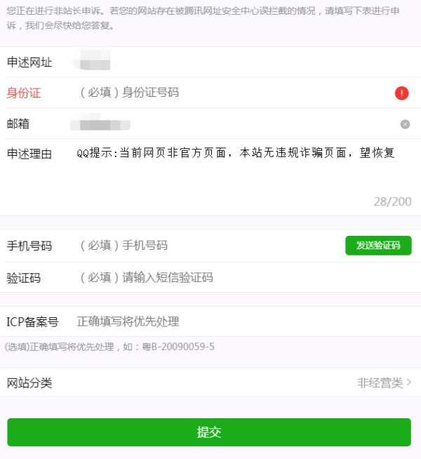 填寫好網址,身份證郵箱,手機驗證,備案號,選擇非經營類。提交申述。